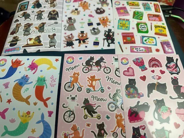 Moonbow Creative Stickers are probably great for the sticker lover in your life who collects stickers or wants some fun rainbow stickers. There are a lot of rainbow or holographic stickers, which are normally my catnip, but I think I’m just too old for most of these stickers, even though they have dedicated reader stickers AND even more book stickers. They have charcuterie stickers (can confirm they are fun) and pickle stickers that I’ve never been able to get my hands on. And someone whose name I’m skipping out on who teaches iPad art designs some stuff and while I snagged it, I can’t find the sticker sheet’s name on the site, the designer on the site, or on my invoice.